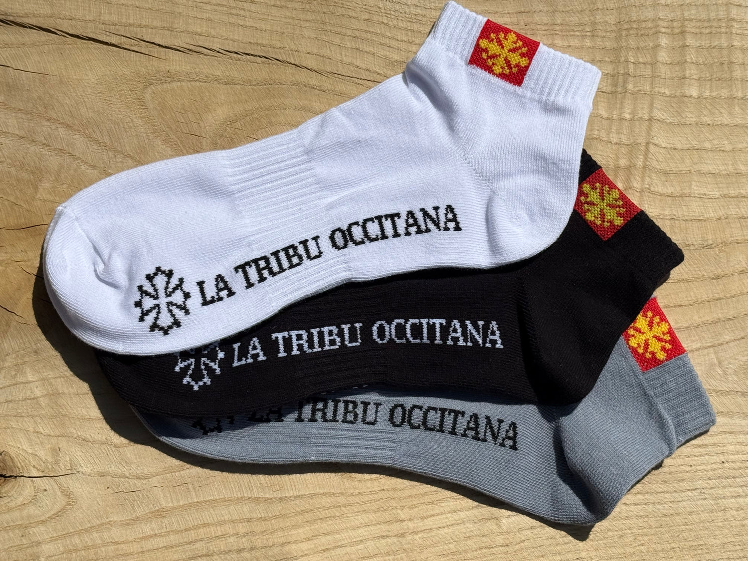 Le premier produit lancé par Tribu Occitana n’a pas été choisi au hasard : des chaussettes ornées de la croix occitane, disponibles au choix en trois coloris, par packs de deux paires.